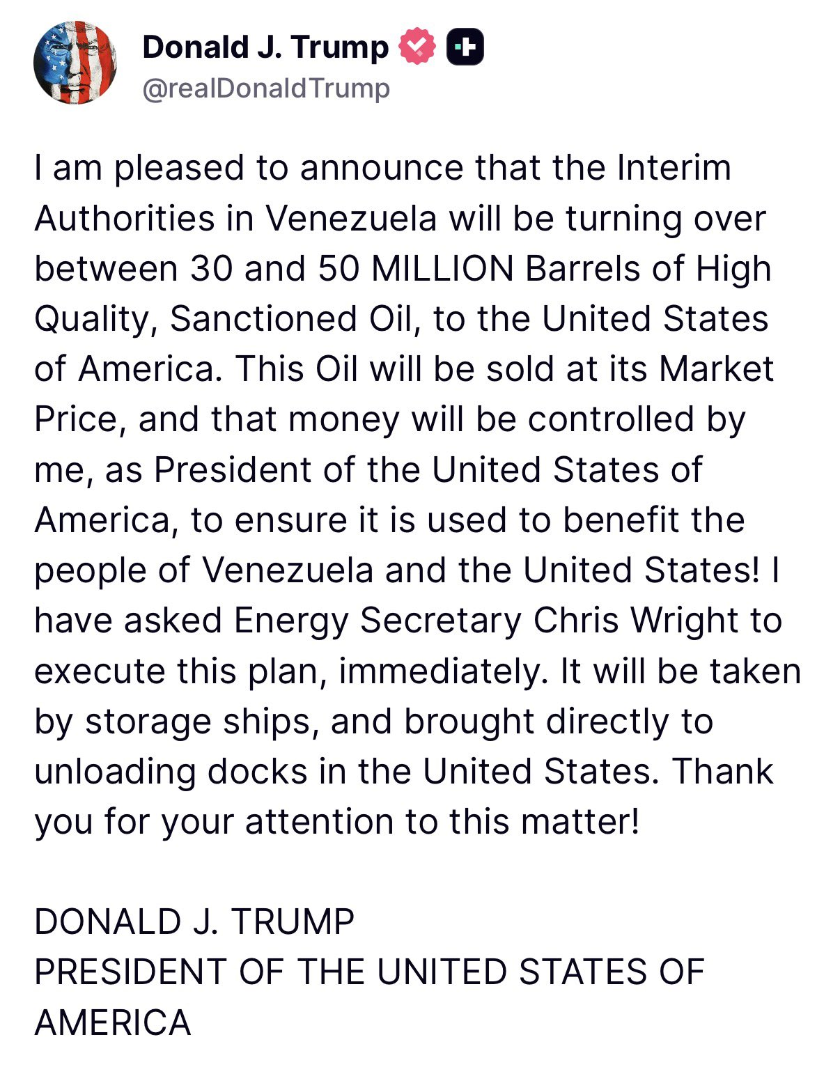 In a statement posted to his Truth Social platform, Trump declared, "I am pleased to announce that the Interim Authorities in Venezuela will be turning over between 30 and 50 MILLION Barrels of High Quality, Sanctioned Oil, to the United States of America."